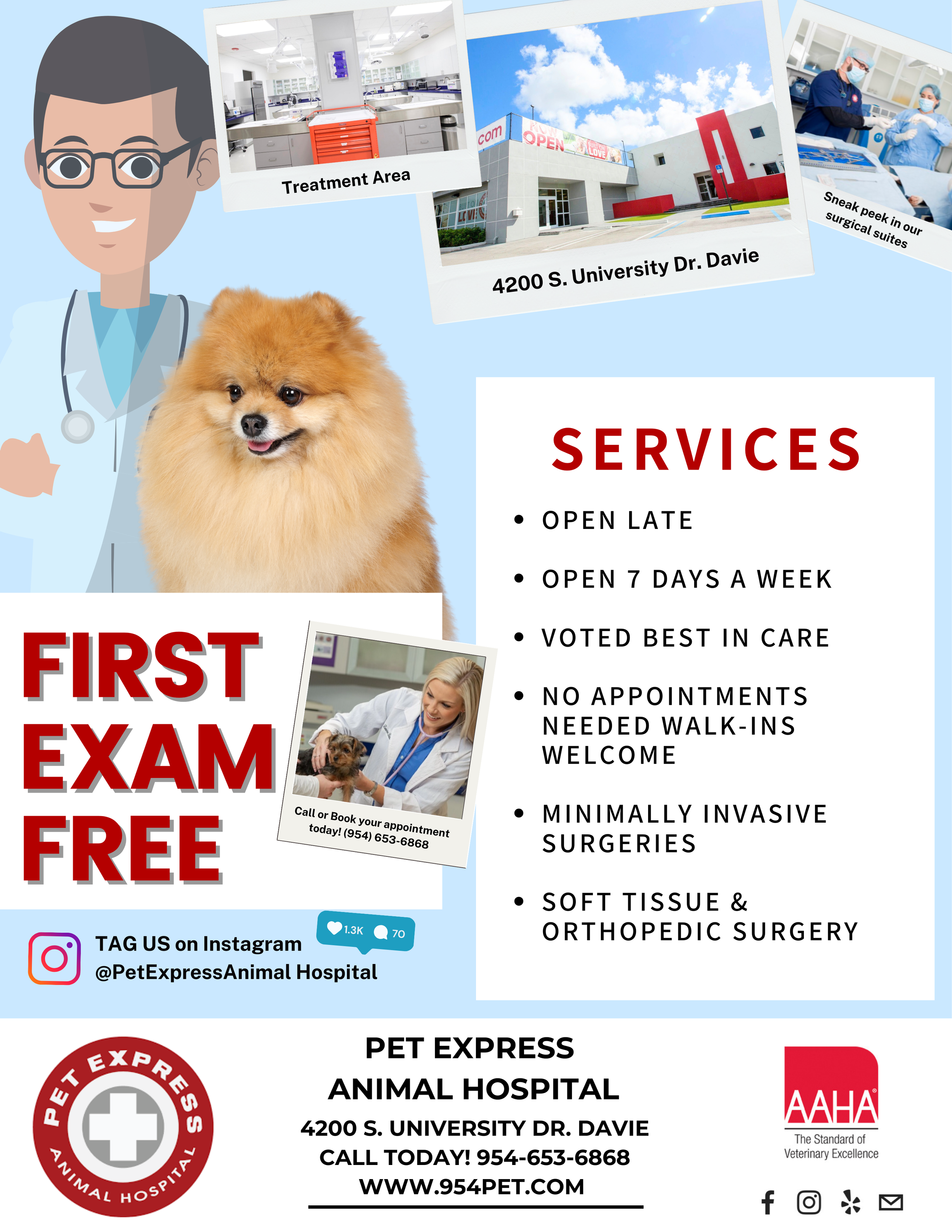 Pet Express Animal Hospital is a family owned AAHA accredited veterinary hospital located in sunny South Florida. Pet Express is a three-acre state-of-the art 20,000 square foot facility. We currently have 4 veterinarians on staff. Pet Express is a full-service animal hospital seeing wellness, Primary care, urgent care and emergency patients. We pride ourselves in having the newest medical equipment in CT, Ultrasound, Olympus Endoscopy Suite, Full in-house lab department, Dental and surgical suites.